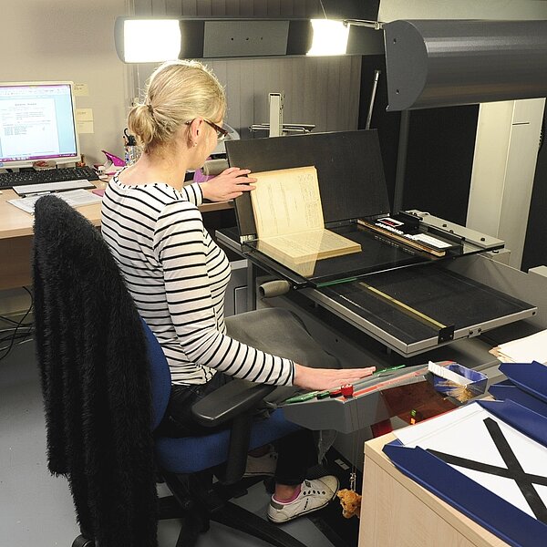 (Foto: Eine Mitarbeiterin des Landesarchivs Thüringen bei der Qualitätskontrolle. Aufnahme: T. Schmidt, 2017.)